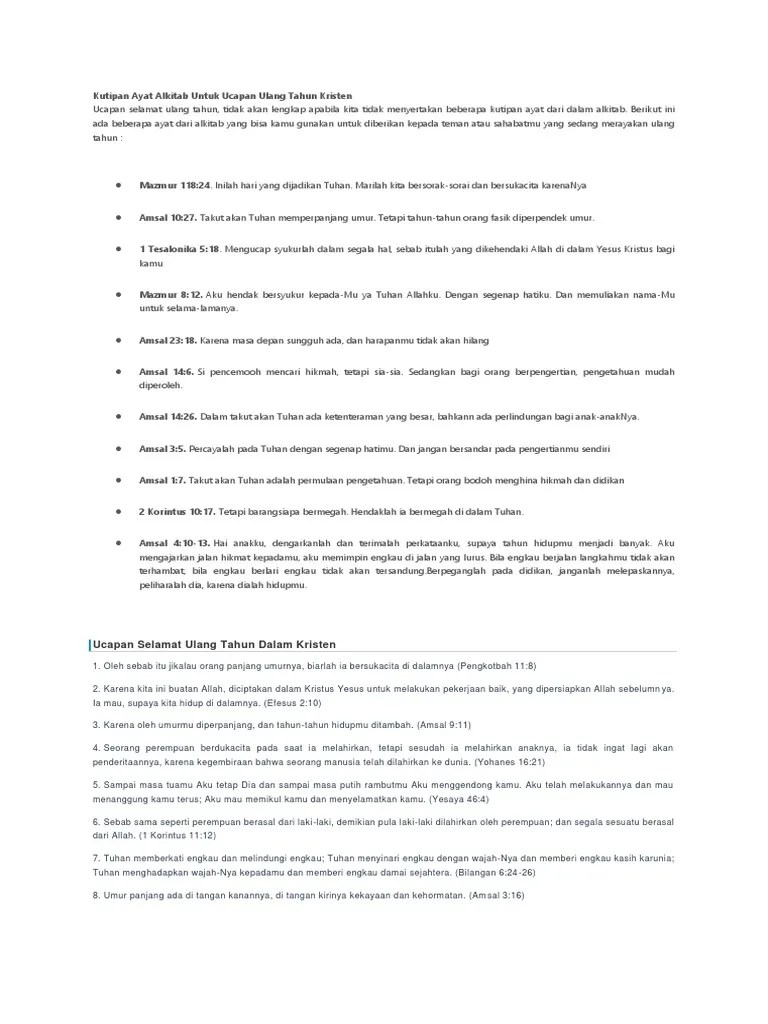 Ucapan ulang tahun kristen terbaik dari ayat alkitab untuk anak, pacar,. Dan aku akan diam dalam rumah tuhan sepanjang . Beri tahu dia yang sedang ulang tahun hari ini bahwa betapa selama ini kehidupannya. Kebajikan dan kemurahan belaka akan mengikuti aku, seumur hidupku; Ada baiknya kata kata itu diisi dengan ayat alkitab tentang hari kelahiran yang bisa kita temukan di dalam bacaan bacaan firman dalam injil.
